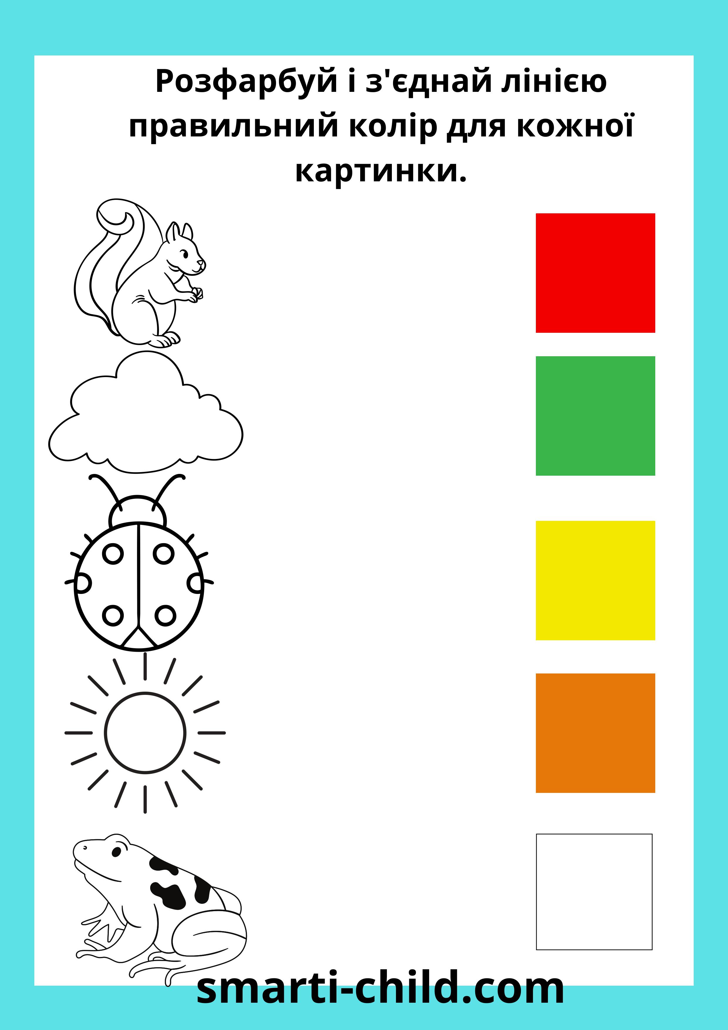 Розфарбуй і з'єднай лінією правильний колір для кожної картинки.