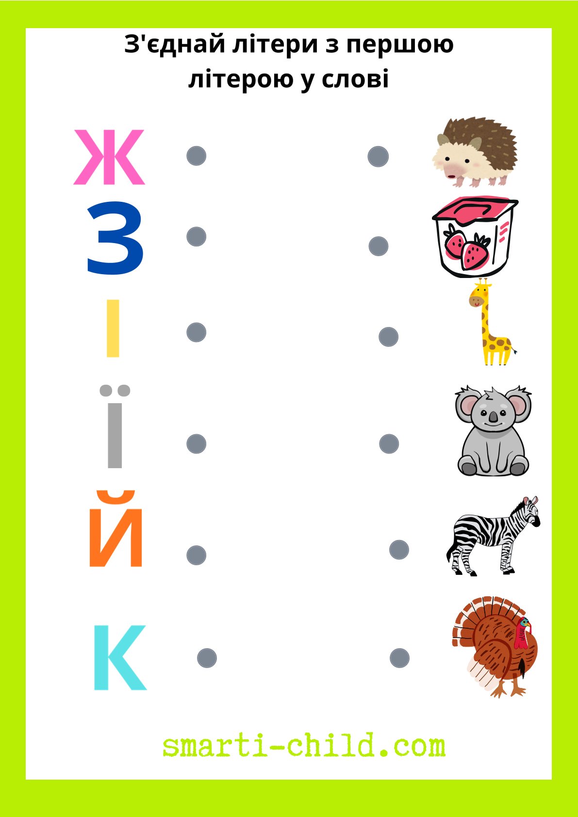 Роздрукуйте та запропонуйте дитині з'єднати літеру зі словом. Такі вправи допомогаають вивчити алфавіт та розвивають логіку та уяву.