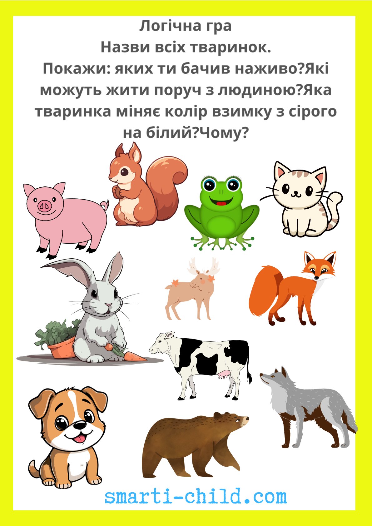 Попросіть дитину назвати всіх тварин. Задавайте питання вказані на аркуші і не тільки. Задавайте запитання та вислуховуйте відповіді до кінця. Такі ігри допомагають розвивати мову, словниковий запас, також розвивають уяву та логіку.