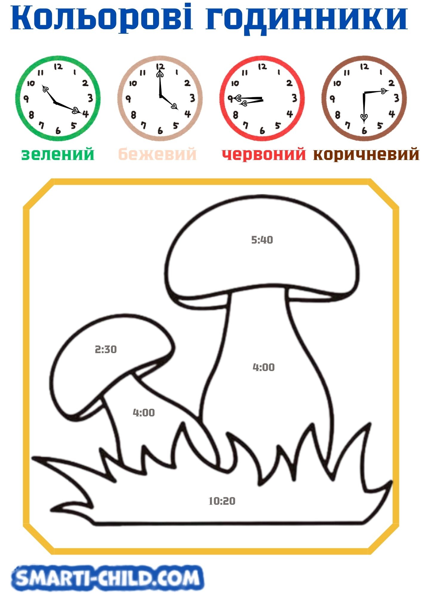 Поясніть правило: у завданні кожен записаний час потрібно зафарбувати у той колір, який відповідає годиннику з таким самим часом. Допоможіть дитині знайти на малюнку всі вказані часи.