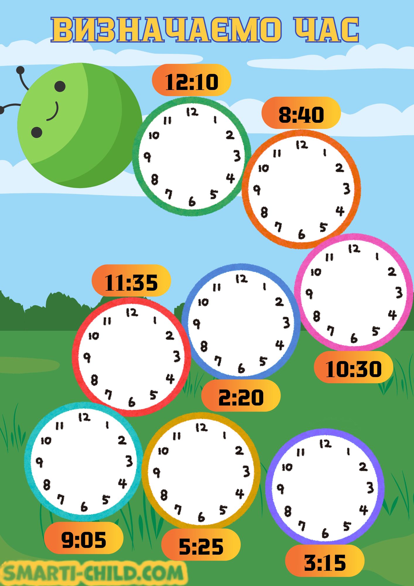 Разом потренуйтеся: наприклад, час 12:10 – коротка стрілка трохи після 12, довга – на цифрі 2.