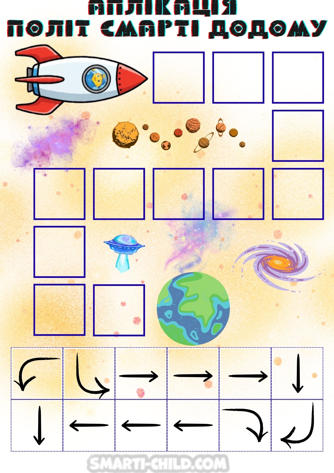 1️⃣ Роздивіться разом із дитиною ракету 🛸, планету 🌍 та квадратики для стрілок.