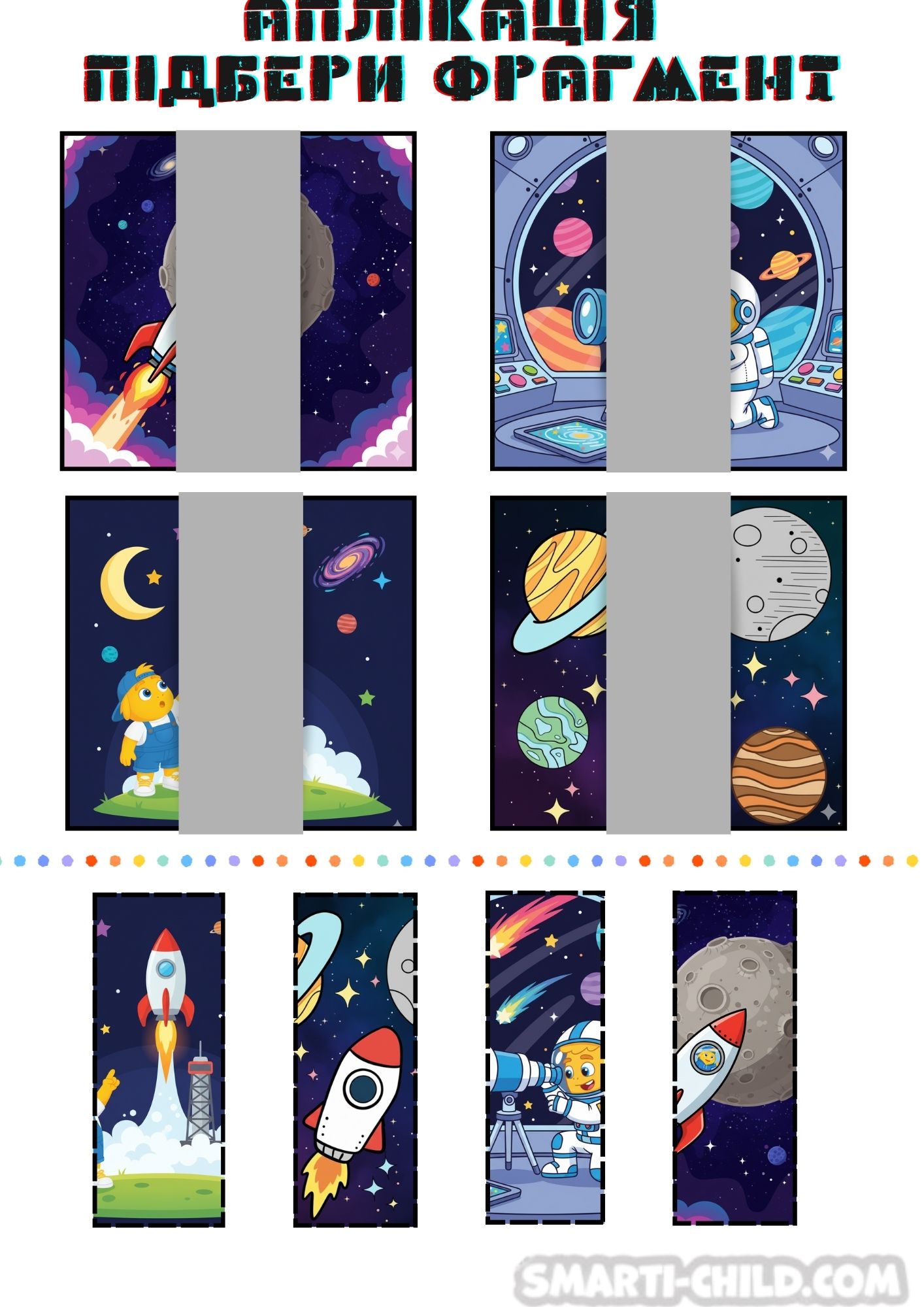 Наприклад, якщо фрагмент показує частину ракети, нехай дитина знайде верхній малюнок, де видно іншу частину ракети, або продовження пейзажу/космонавта.
