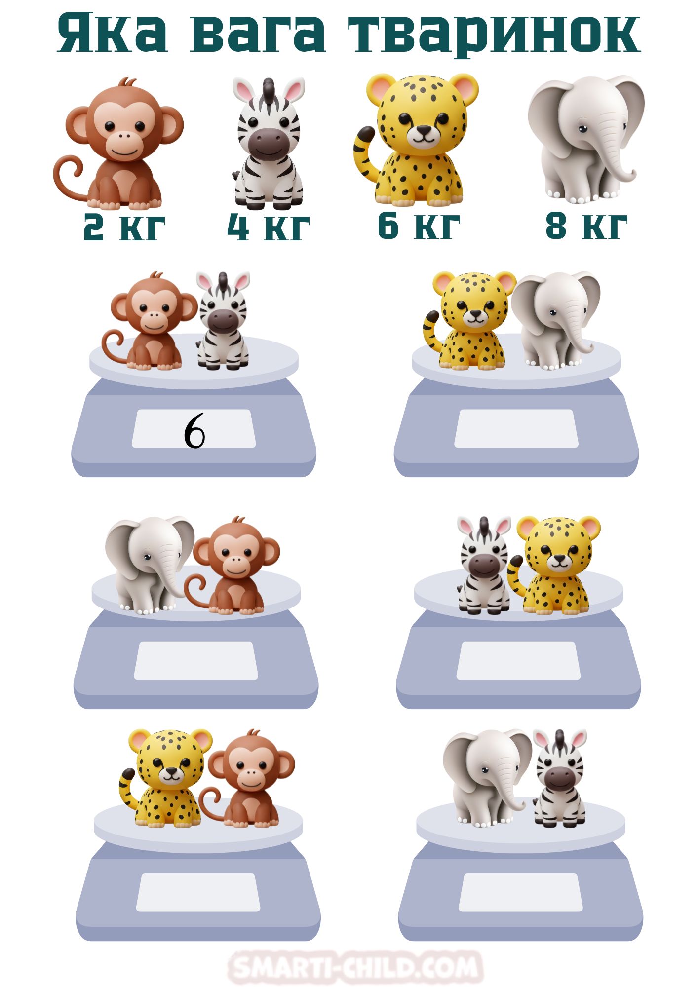 Порахуй загальну вагу тваринок. Напиши відповідь за взірцем.