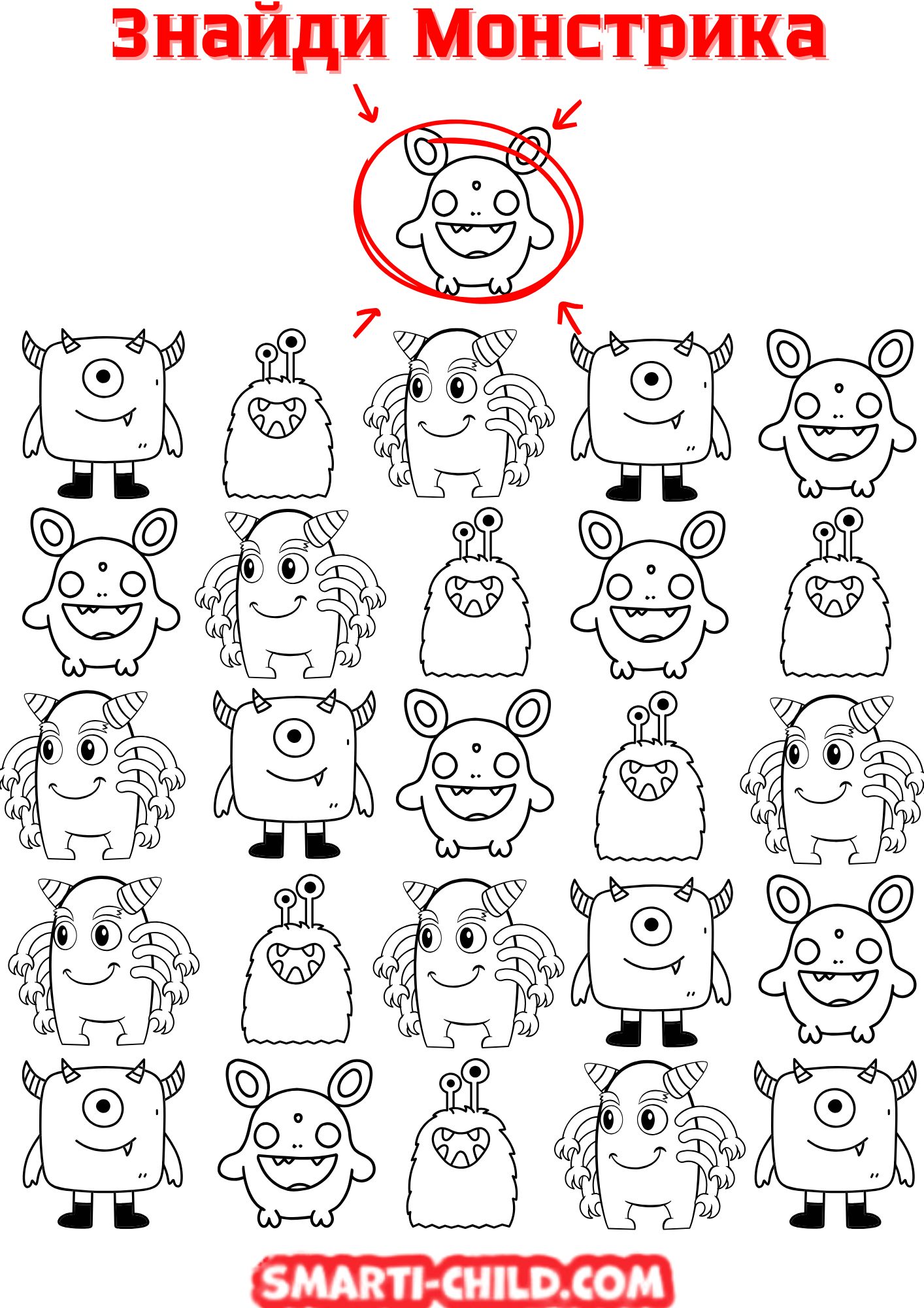 Запропонуйте дитині уважно порівняти зразок із іншими монстриками. Звертайте увагу на деталі: