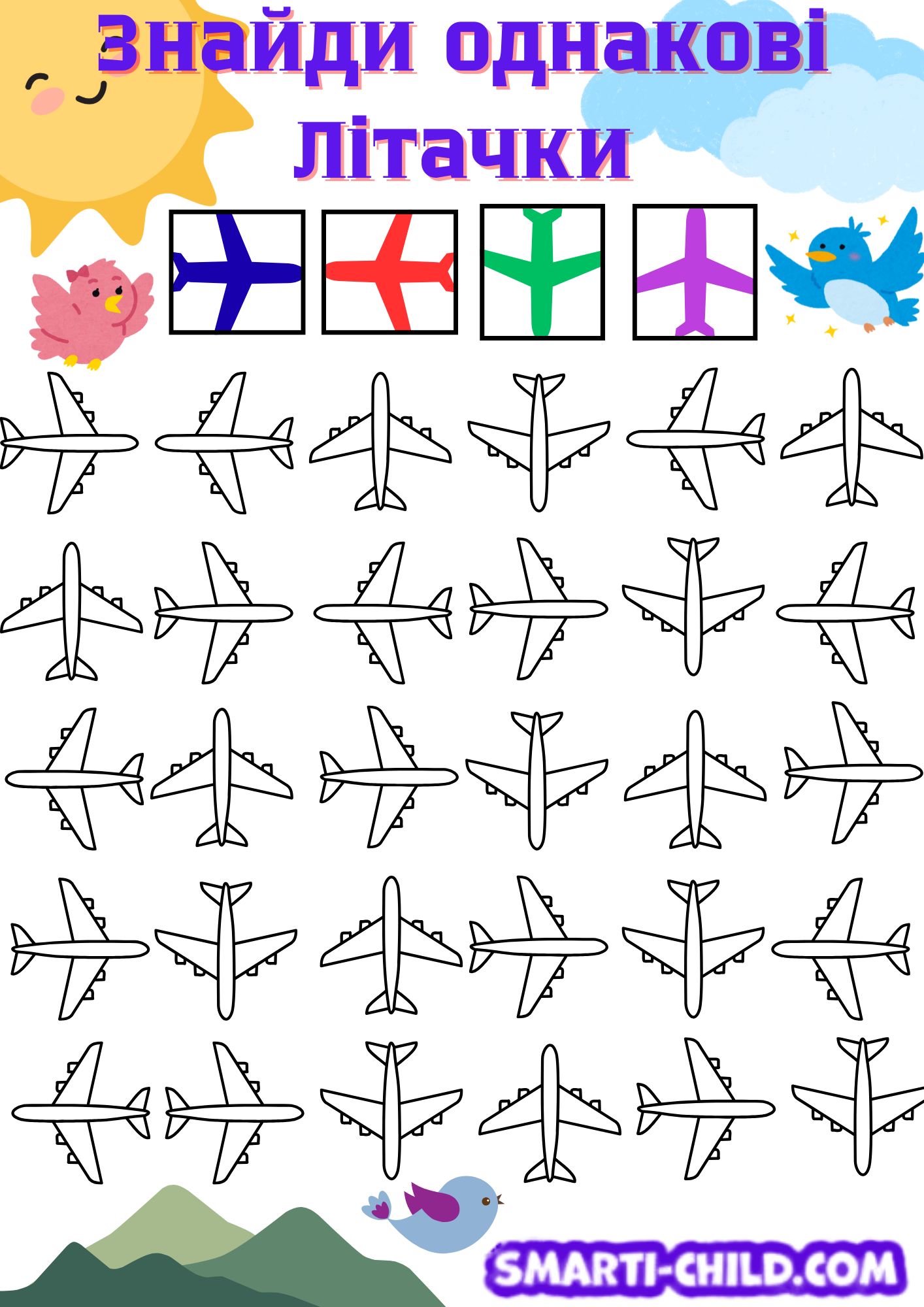Поясніть Незалежність Форми: Зверніть увагу дитини на чотири кольорові зразки вгорі. Поясніть: "Усі ці літачки (чорно-білі) належать до одного з цих чотирьох типів. Вони можуть летіти вправо, вліво, вгору чи вниз, але їхня ФОРМА (крила, хвіст) завжди залишається однаковою."