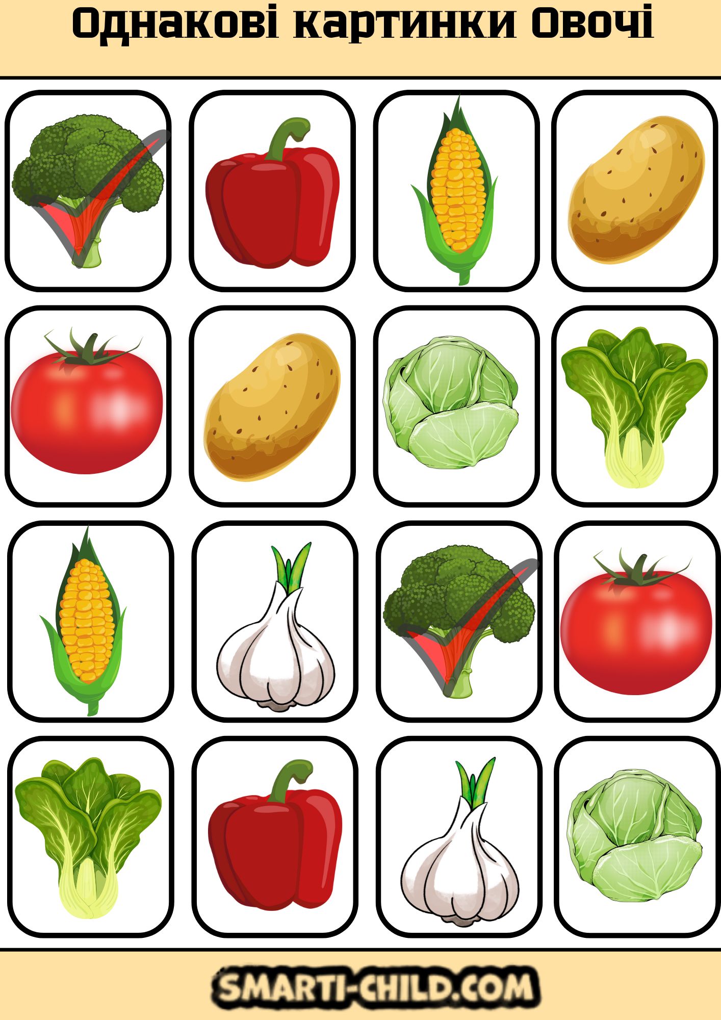 Поясніть дитині, що на ігровому полі є дві абсолютно однакові картки для кожного виду овочів.