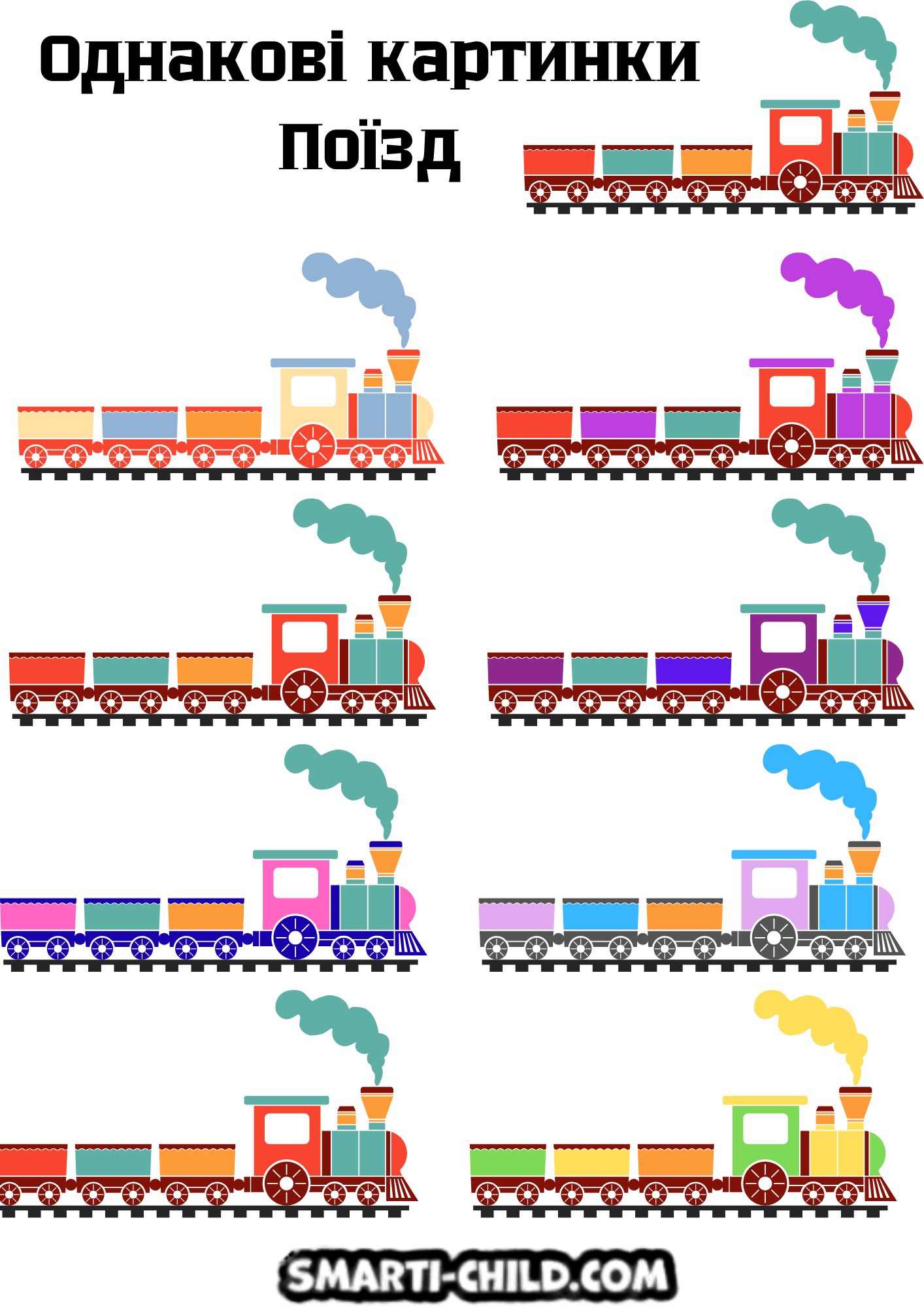 Завдання — знайти дві абсолютно однакові пари поїздів, де всі деталі (локомотив, вагони, дим) збігаються за кольором.