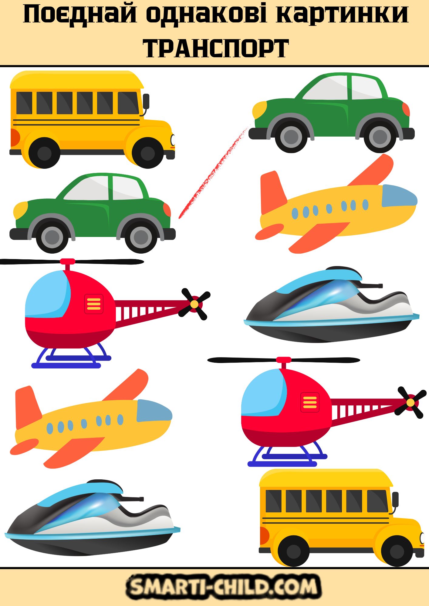 Коли пара знайдена, попросіть дитину провести лінію олівцем або маркером, що з'єднує ці два однакові транспортні засоби.
