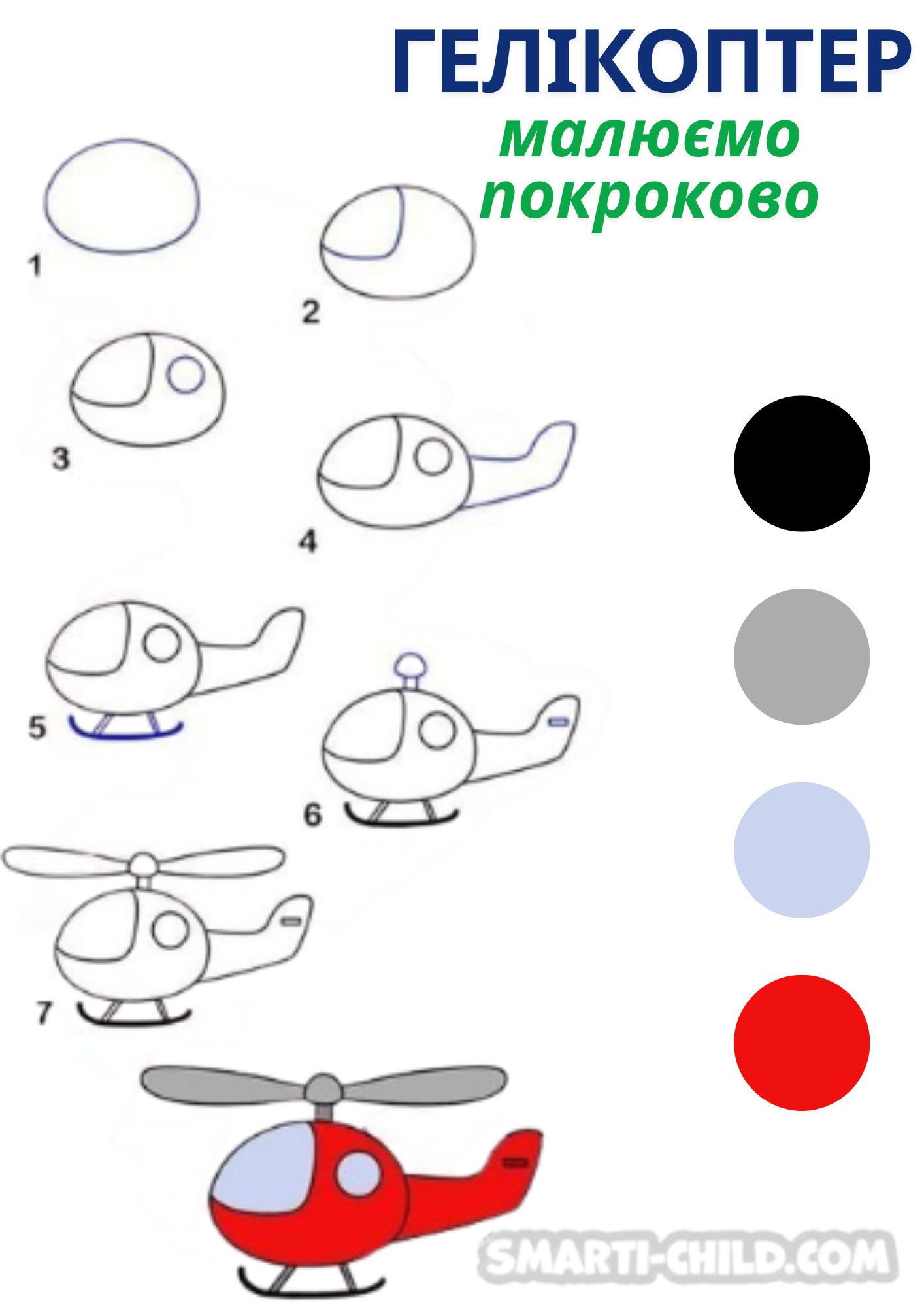 Використайте запропоновані кольори (червоний для корпусу, сірий для гвинтів, блакитний для вікон) або будь-які інші кольори, які подобаються вашій дитині, щоб оживити гелікоптер.