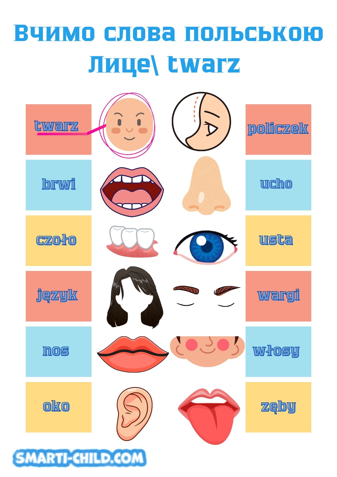 Почніть з верхнього лівого кута. Вказуйте на польське слово (наприклад, "twarz") і чітко промовляйте його вголос.