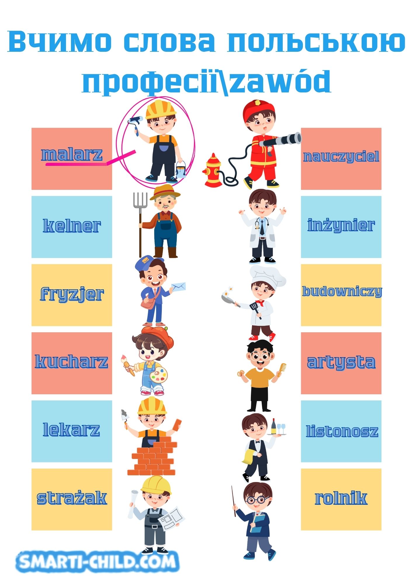 Або навпаки: назвіть професію польською (наприклад, "lekarz") і попросіть дитину показати на відповідну картинку.