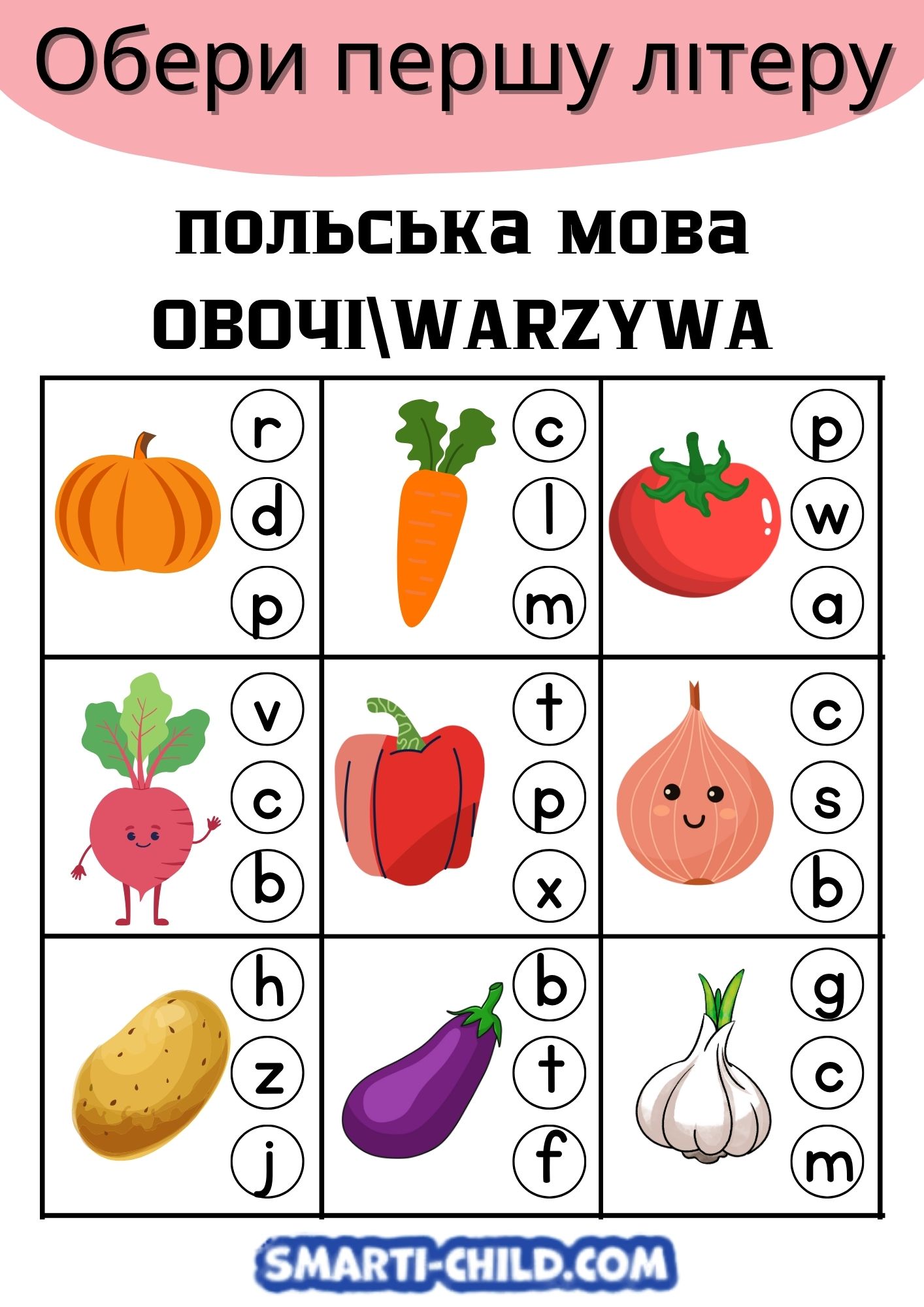 Після завершення всіх завдань пройдіться по аркушу ще раз, називаючи овоч та його першу літеру польською.