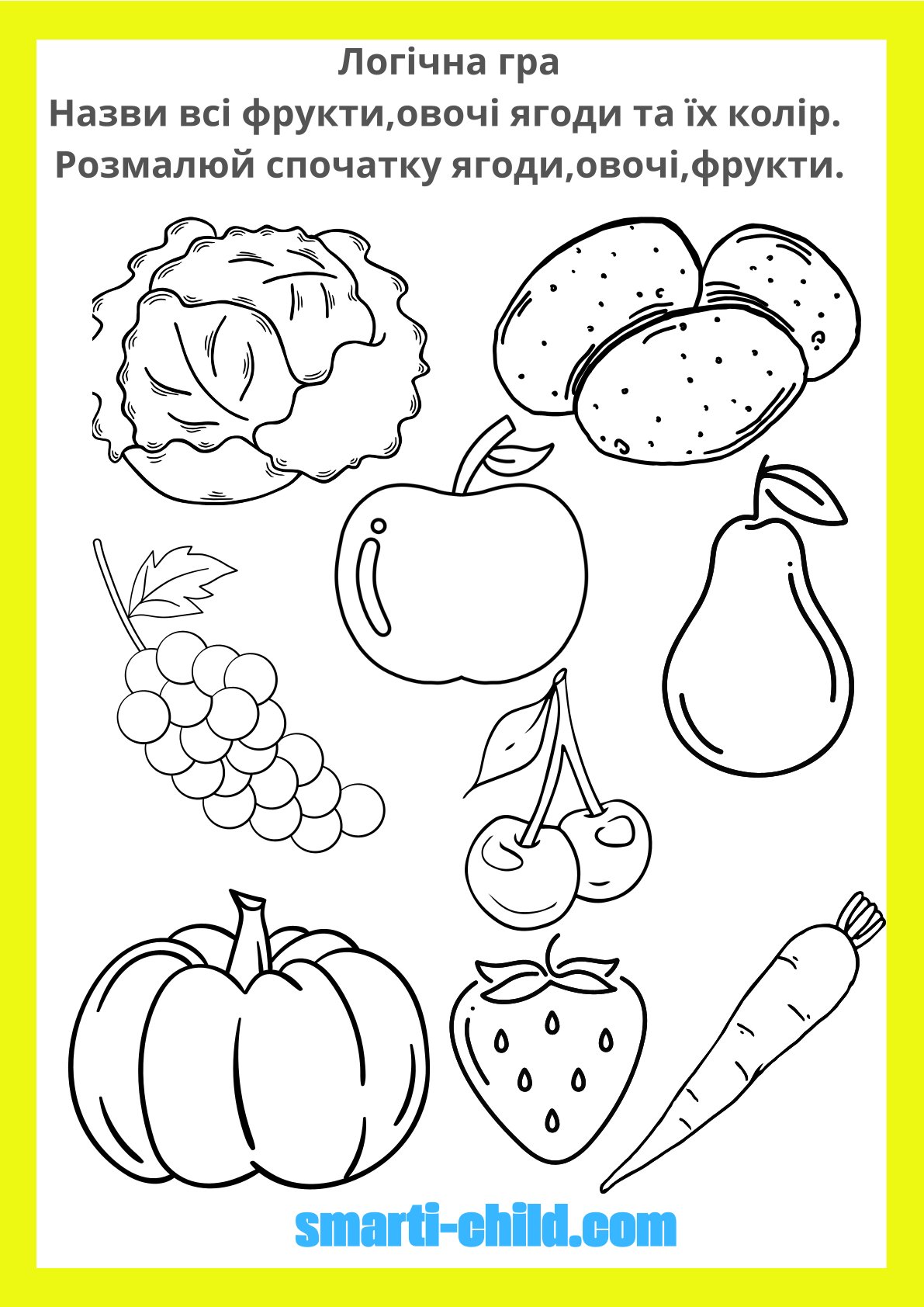 З цим робочим листом можна потоврити фрукти, ягоди, овочі та кольори. А також логіку, тому що дитині потрібно самостійно згадати кольори. Покладіть поряд з дитиною олівці, нехай самостійно вибирає колір. Якщо не пам'ятає, нічого страшного, допоможіть. Можете через час взяти цей же лист і швидше за все дитина згадає. Також таке завдання тренує пам'ять.