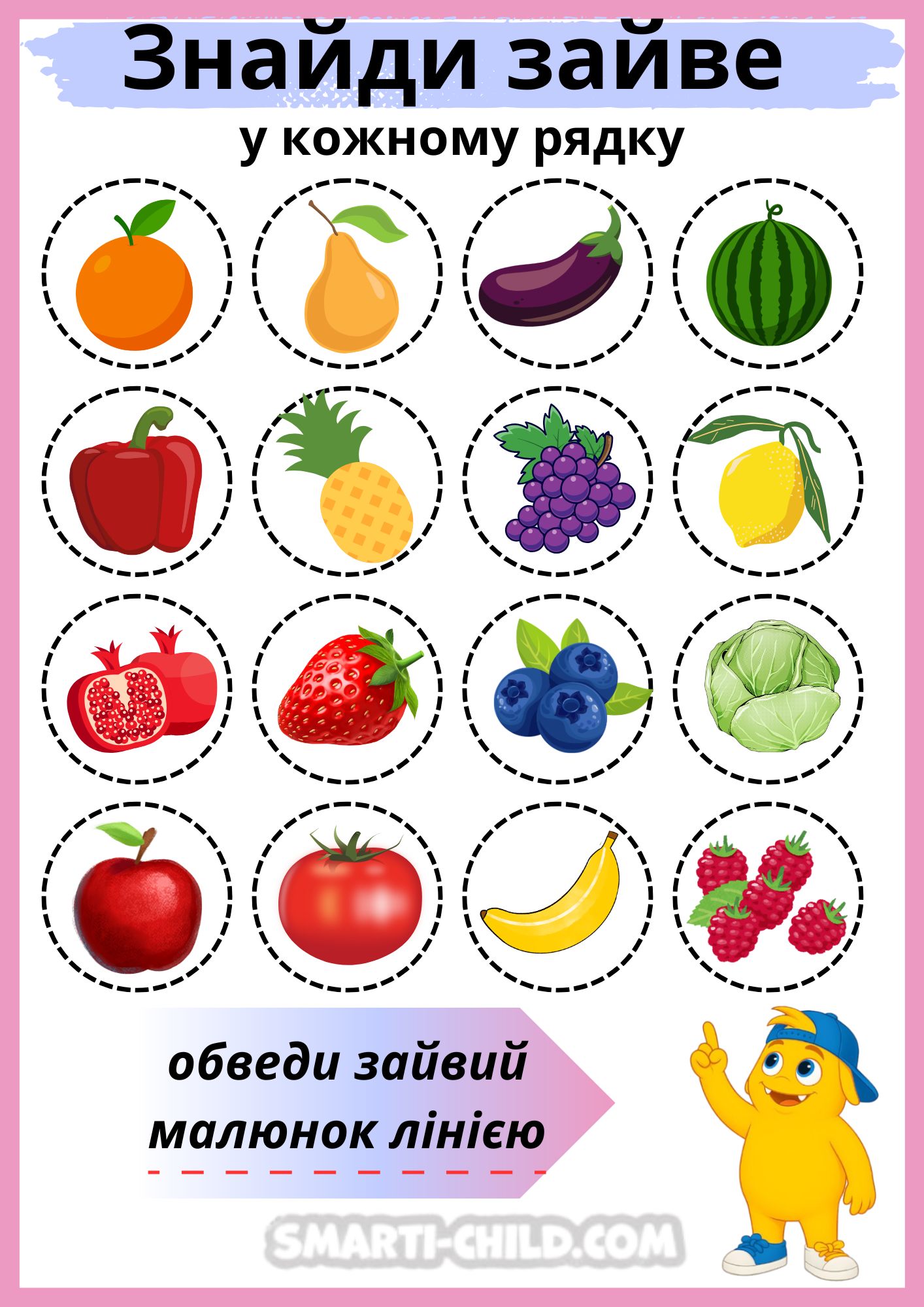 Знайди зайвий малюнок у кожному рядку, обведи його червоним олівцем.