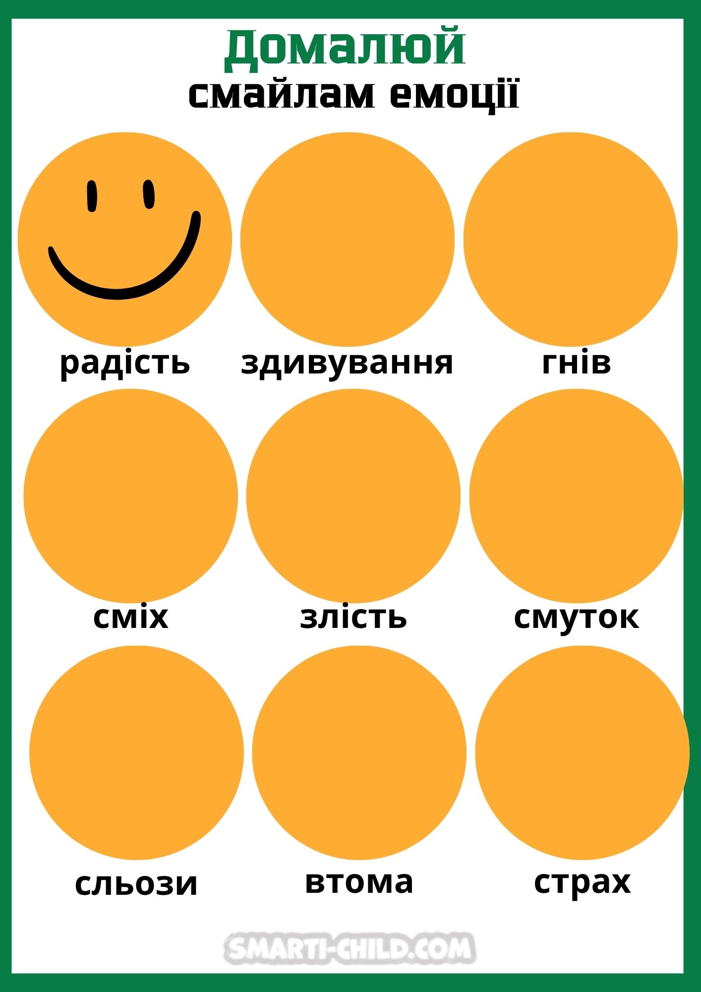 Домалювати вираз обличчя: Використовуючи прості форми (крапки, лінії, дуги) для очей, брів, рота, дитина має зобразити відповідну емоцію на кожному смайлі.