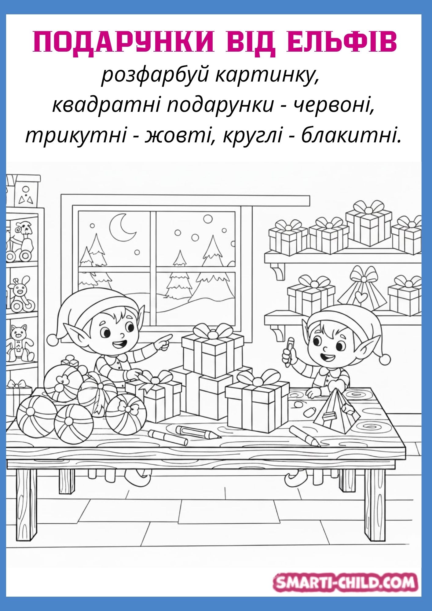 Розфарбуй картинку, квадратні подарунки - червоні, трикутні - жовті, круглі - блакитні.
