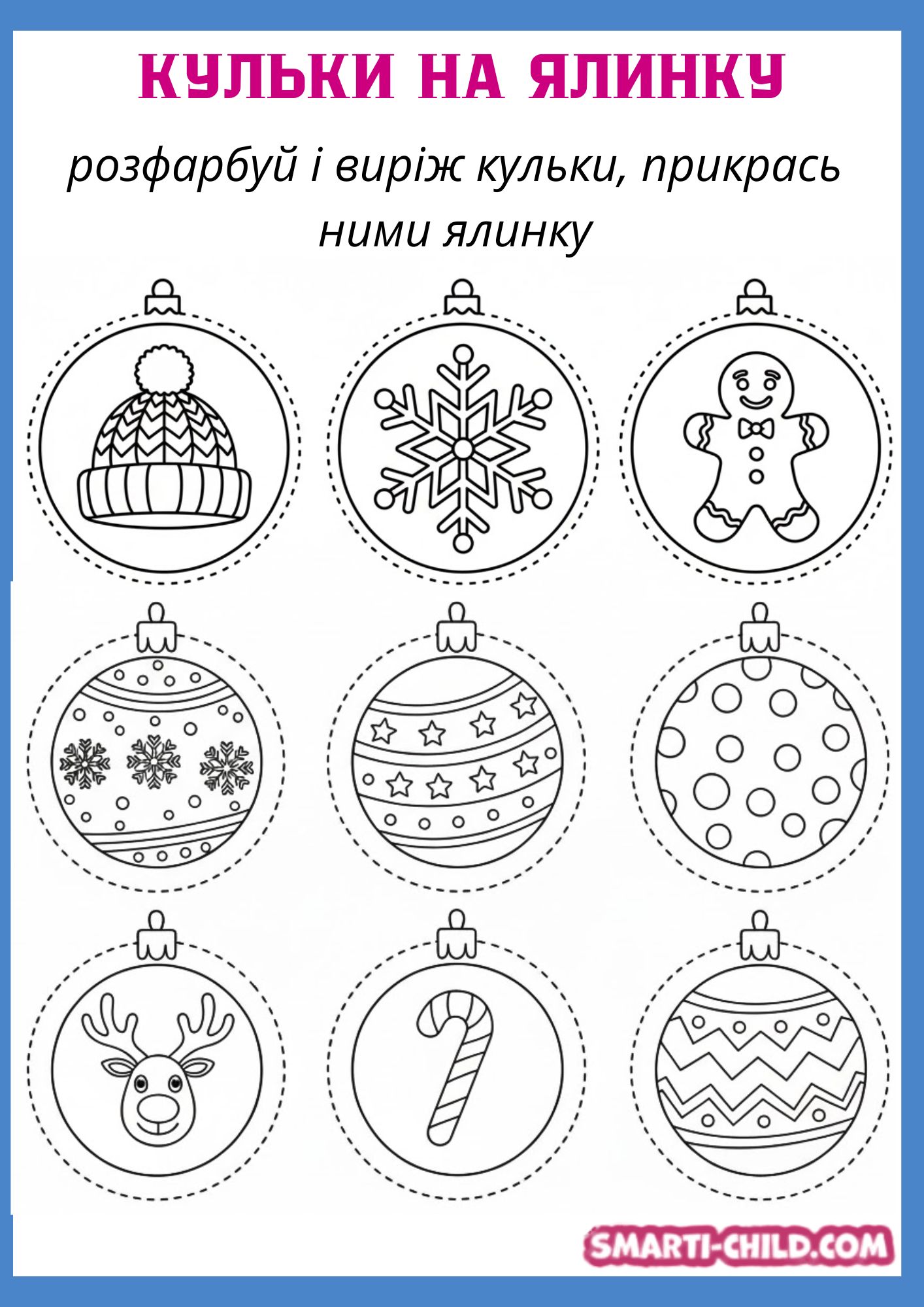 Розфарбуй і виріж кульки, прикрась ними ялинку.