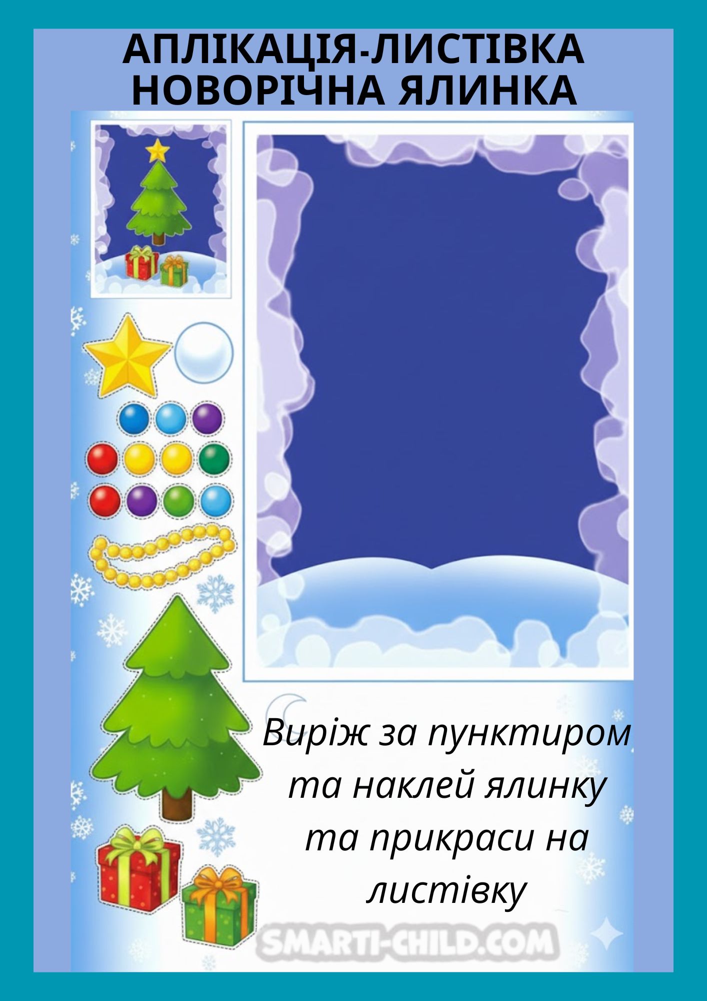 Виріж за пунктиром та наклей ялинку та прикраси на листівку.
