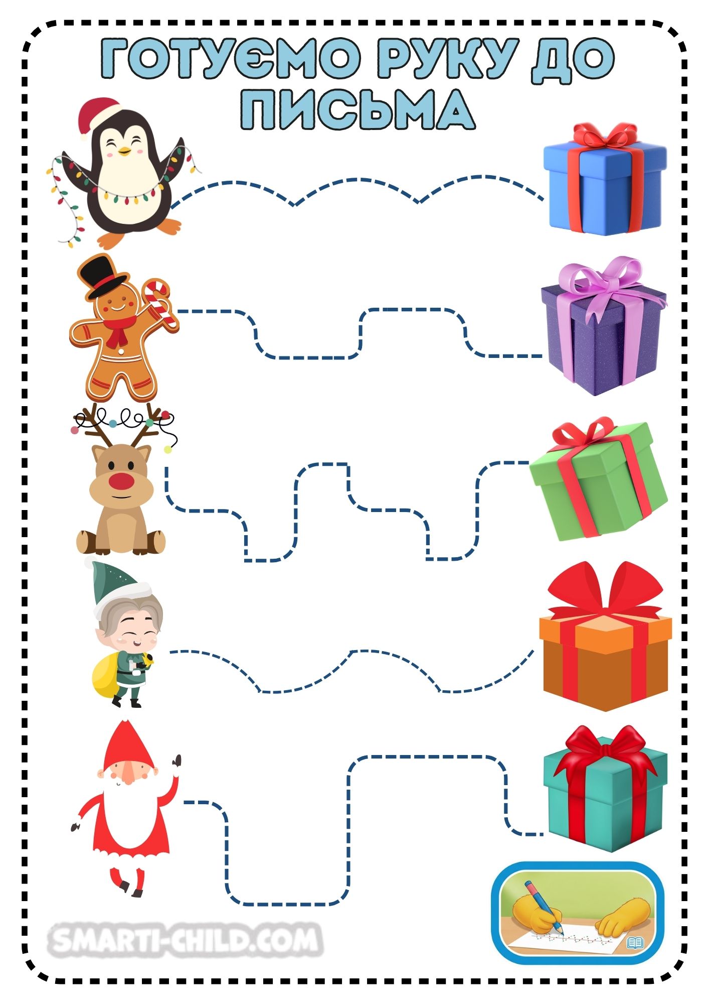 Проведи кожного героя до подарунку. Для цього треба провести кольоровою ручкою чи маркером по пунктирній лінії.