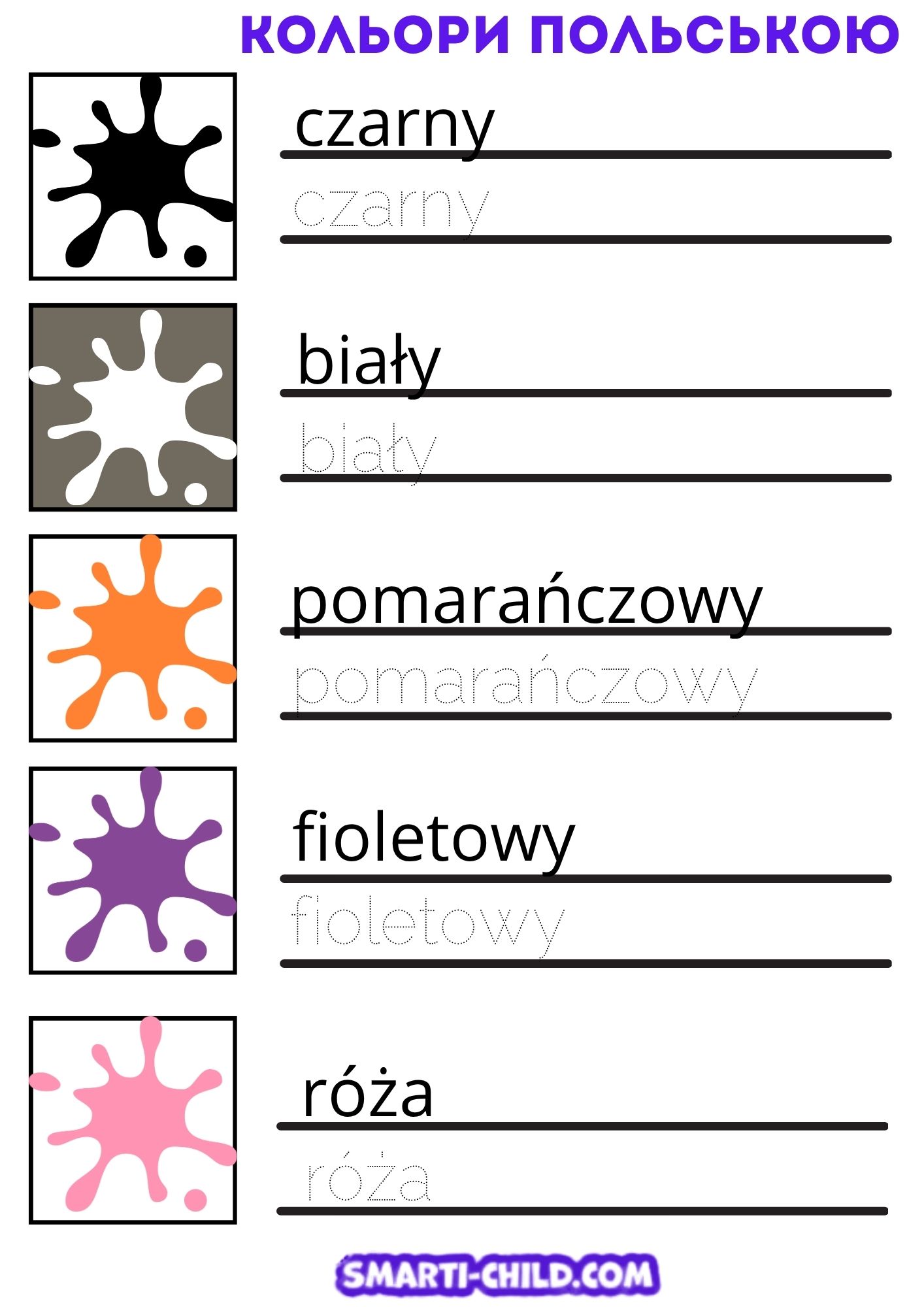 Прописи польською назв популярних кольорів. Спробуй написати слова за взірцем.
