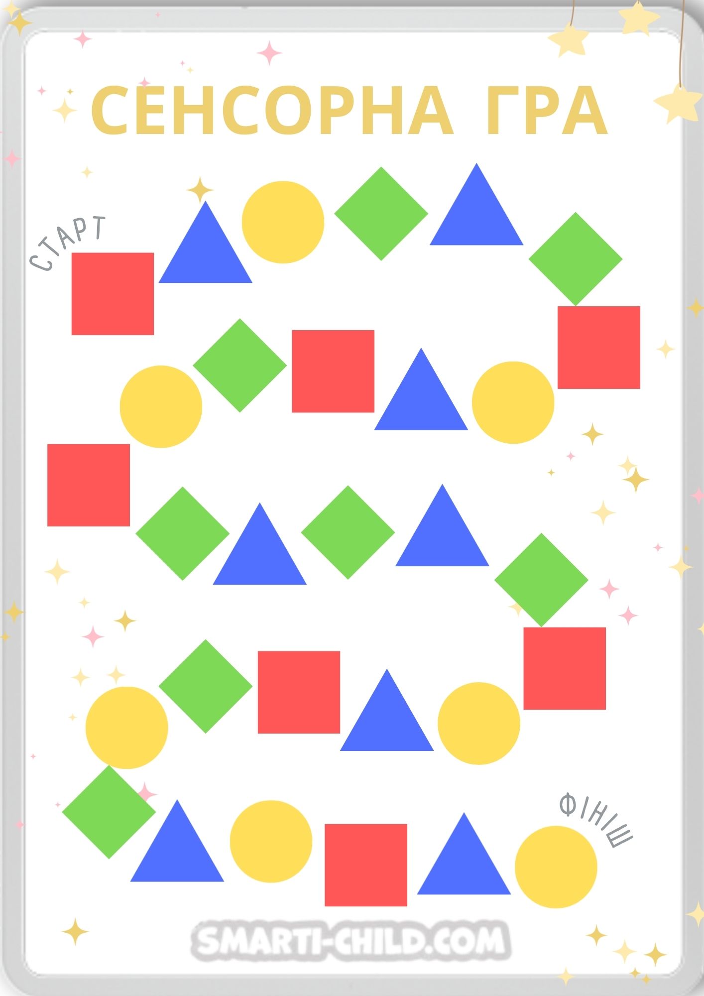 Завершення: Гра продовжується, доки гравець не пройде всю доріжку і не торкнеться останньої фігури біля ФІНІШ.